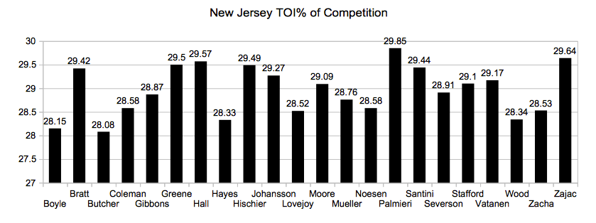 TOI% of Competition: percentage of even-strength time opponent takes of his team player skates against