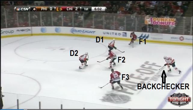 Backcheckers = Defending players chasing the rush by F1, F2 & F3