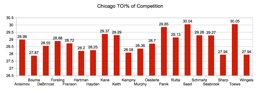 TOI% of Competition: percentage of even-strength time opponent takes of his team player skates against