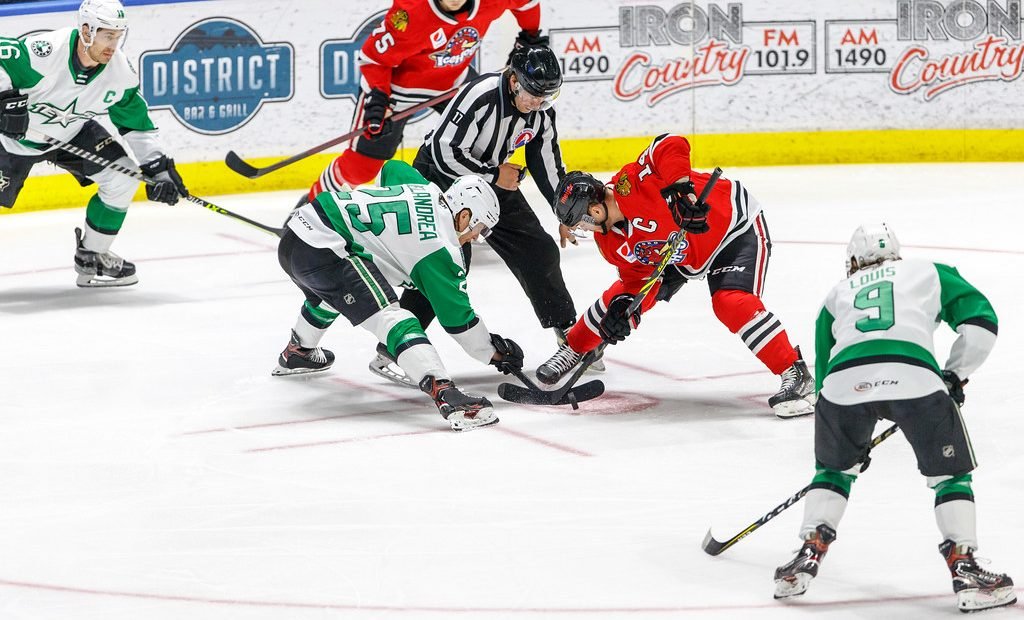 • The goal scorers in Game 1 were Lukas Reichel and Carson Gicewicz. Reichel deftly handled a pass from Michal Teply on a 2-on-1 in the second period and snapped home the first goal of the game. Gicewicz deflected an Issak Phillips shot past Stars goalie Matthew Murray (who played very well in the two games for Texas) for the eventual game-winner.