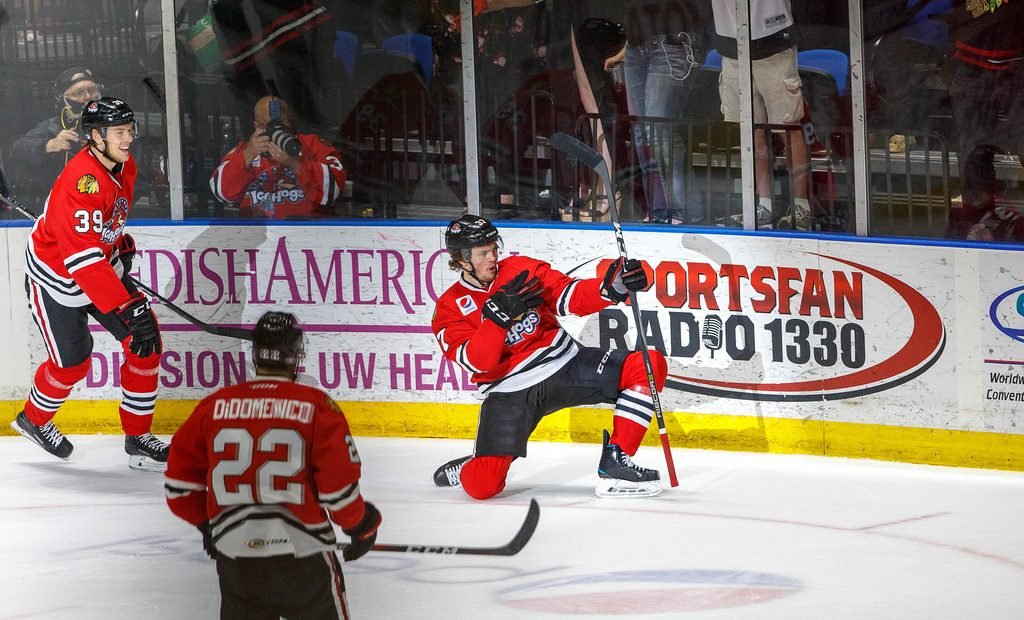 David Kampf got off a nice shot from the left dot that rang off the far post but stayed out of the net a few minutes later. Even so, it was a dominant first-period for the IceHogs.