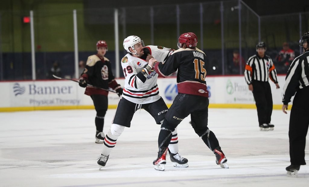After several seasons of seeing its fight totals dropping, Rockford is currently tied for fourth with 32 fighting majors this season. With Tucson at the top of the league with 43 fighting majors, it should come as no surprise that some gloves hit the ice over the weekend.