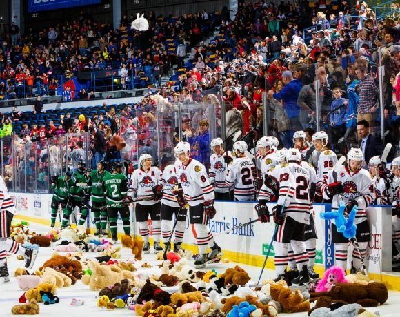 The teddy bear tossers would have to wait nearly half the game to send their furry offerings to the ice surface. There dreams were realized when Anthony Louis broke Rockford’s 0-35 home power play slump with a snipe from the right dot. Vinnie Hinostroza provided the primary apple on the play, which tied things up at a goal apiece 8:01 into the second period.